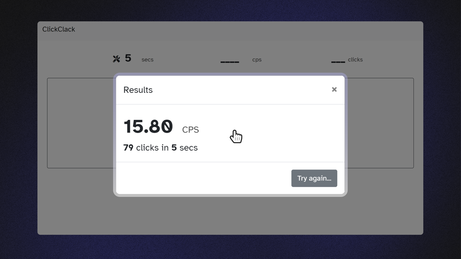 ClickClack is a minimal clicks per second (CPS) testing application. I was really into Minecraft PVP at that time and figured building a CPS tester would be a cool way to try learning about web development.